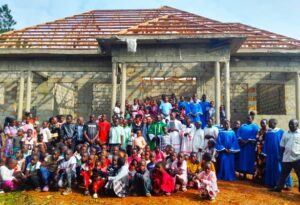 The Parish Church of St. Jude Kyegombwa Catholic Parish is currently under construction. This group photograph, taken in 2025, shows some of the faithful gathered in the foreground together with their Parish Priest, Rev. Fr. Robert Kayiwa.