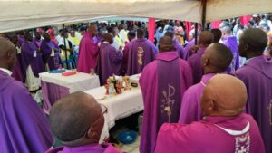 A group of priests attends the burial of Rev. Fr. Emmanuel Kato Lubega’s father in Mabuye on Monday, March 2, 2026. Courtesy photo.